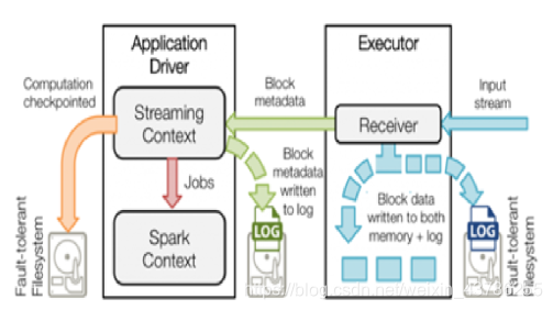 恢复计算(图中的橙色箭头):使用Checkpoint数据重启driver,重新构造上下文并重启接收器。恢复元数据块(图中的绿色箭头):恢复Block元数据。