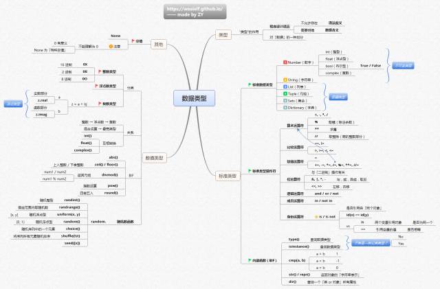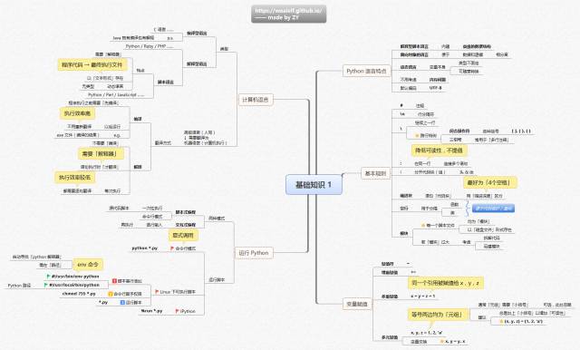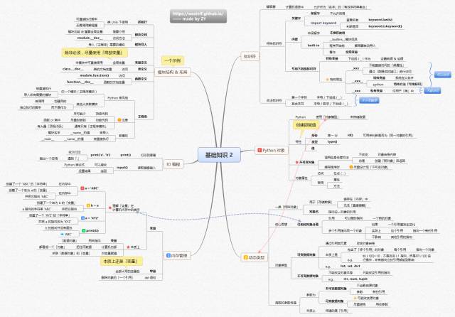 首先,按顺序依次展示了以下内容的一系列思维导图:基础知识,数据类型(数字,字符串,列表,元组,字典,集合),条件&循环,文件对象,错误&异常,函数,模块,面向对象编程;