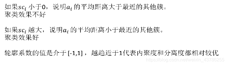 评估标准就是轮廓系数。那么是怎么评估的呢?对于每一个样本都是有轮廓系数的,假设有一点蓝1,①计算蓝1到自身类别的点的距离的平均值记做ai;②分别计算蓝1到红色类别和绿色类别所有点的距离取出平均值b1,b2,取出最小值当做bi;③蓝1的轮廓系数就为(bi-ai)/(max(bi ai));④在极端情况下,假设聚类非常好,外部距离非常大,内部距离非常小,那么bi>>ai(bi远大于ai)那么轮廓系数就为1,如果情况最差ai>>bi,那么轮廓系数就为-1,所以每一个样本的轮廓系数在[-1,1]区间,越靠近1是越好的