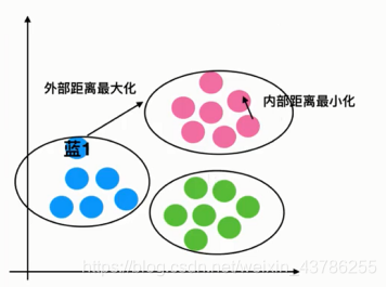 假设分为3个类别如下图,当聚类的时候最好的结果非常相似的样本变成一个类别,那也就是说外部距离是最大的,内部这些样本是非常相似的。所以外部距离(族群与族群之间的距离),越大是越好的,内部各样本之间距离越小越好,这就是聚类的目的。