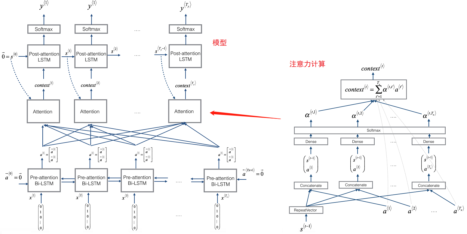 # GRADED FUNCTION: one_step_attentiondef one_step_attention(a, s_prev):"""Performs one step of attention: Outputs a context vector computed as a dot product of the attention weights"alphas" and the hidden states "a" of the Bi-LSTM.Arguments:a -- hidden state output of the Bi-LSTM, numpy-array of shape (m, Tx, 2*n_a)s_prev -- previous hidden state of the (post-attention) LSTM, numpy-array of shape (m, n_s)Returns:context -- context vector, input of the next (post-attetion) LSTM cell"""### START CODE HERE #### Use repeator to repeat s_prev to be of shape (m, Tx, n_s) so that you can concatenate it with all hidden states "a" (≈ 1 line)s_prev = repeator(s_prev)# Use concatenator to concatenate a and s_prev on the last axis (≈ 1 line)concat = concatenator(inputs=[a, s_prev])# Use densor1 to propagate concat through a small fully-connected neural network to compute the "intermediate energies" variable e. (≈1 lines)e = densor1(concat)# Use densor2 to propagate e through a small fully-connected neural network to compute the "energies" variable energies. (≈1 lines)energies = densor2(e)# Use "activator" on "energies" to compute the attention weights "alphas" (≈ 1 line)alphas = activator(energies)# Use dotor together with "alphas" and "a" to compute the context vector to be given to the next (post-attention) LSTM-cell (≈ 1 line)context = dotor([alphas, a])### END CODE HERE ###return context
