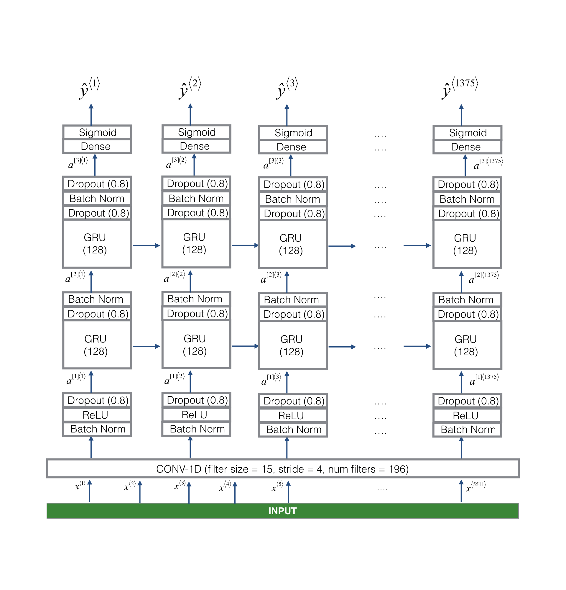 # GRADED FUNCTION: modeldef model(input_shape):"""Function creating the model's graph in Keras.Argument:input_shape -- shape of the model's input data (using Keras conventions)Returns:model -- Keras model instance"""X_input = Input(shape = input_shape)### START CODE HERE #### Step 1: CONV layer (≈4 lines)X = Conv1D(filters=196,kernel_size=15,strides=4)(X_input) # CONV1DX = BatchNormalization()(X) # Batch normalizationX = Activation('relu')(X) # ReLu activationX = Dropout(rate=0.8)(X) # dropout (use 0.8)# Step 2: First GRU Layer (≈4 lines)X = GRU(128, return_sequences=True)(X) # GRU (use 128 units and return the sequences)X = Dropout(rate=0.8)(X) # dropout (use 0.8)X = BatchNormalization()(X) # Batch normalization# Step 3: Second GRU Layer (≈4 lines)X = GRU(128, return_sequences=True)(X) # GRU (use 128 units and return the sequences)X = Dropout(rate=0.8)(X) # dropout (use 0.8)X = BatchNormalization()(X) # Batch normalizationX = Dropout(rate=0.8)(X) # dropout (use 0.8)# Step 4: Time-distributed dense layer (≈1 line)X = TimeDistributed(Dense(1, activation = "sigmoid"))(X) # time distributed (sigmoid)### END CODE HERE ###model = Model(inputs = X_input, outputs = X)return model