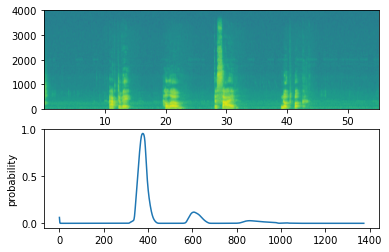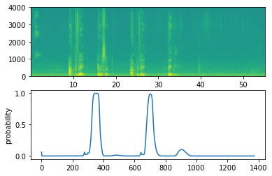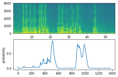 def detect_triggerword(filename):plt.subplot(2, 1, 1)x = graph_spectrogram(filename)# the spectogram outputs (freqs, Tx) and we want (Tx, freqs) to input into the modelx = x.swapaxes(0,1)x = np.expand_dims(x, axis=0)predictions = model.predict(x)plt.subplot(2, 1, 2)plt.plot(predictions[0,:,0])plt.ylabel('probability')plt.show()return predictions