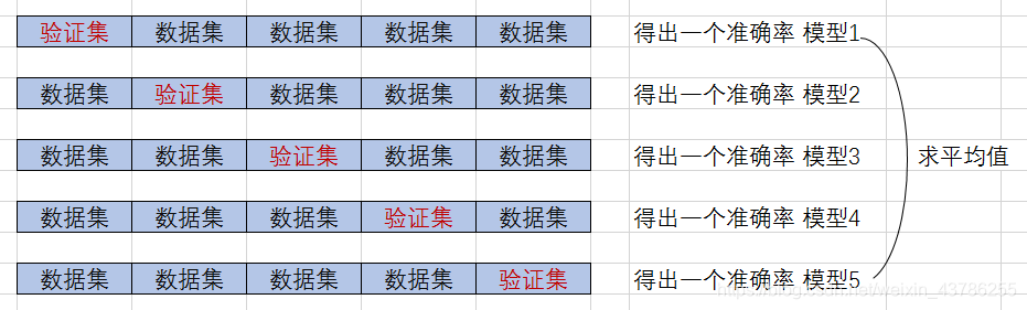 交叉验证过程:将拿到的数据分为数据集和验证集。以下图为例:将数据分成5份,其中一份作为验证集。然后经过5次(组)的测试,每次都更换不同的验证集。即得到5组模型的结果,取平均值作为最终结果。又称5折交叉验证。10折交叉验证是最常用的。