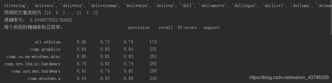 print("每个类别的精确率,召回率和F1:", classification_report(y_test, y_predict, target_names=newsgroups.target_names))