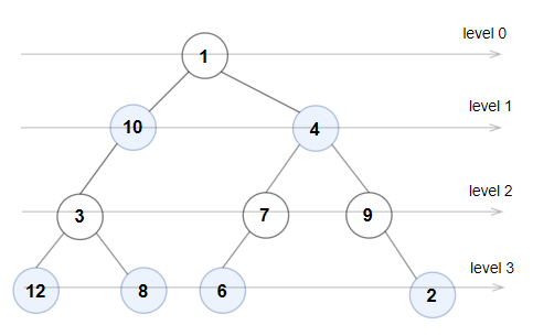 - 偶数下标 层上的所有节点的值都是 奇 整数,从左到右按顺序 严格递增
