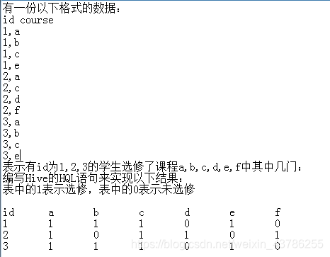 思路:因为要显示所有的课程,所以首先要使用collect_set()函数---将分组中的某列转为一个数组返回,获取到所有课程,然后获取到每一个学员所选的科目,判断有哪些科目,这里可以用if判断语句。所以把查询出一个所有课程作为一个表,每一个学员所选的科目作为另一个表,因为所有课程的表只有一条数据,所以可以用笛卡尔积。