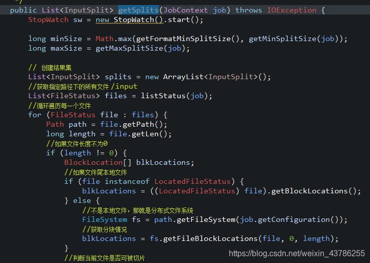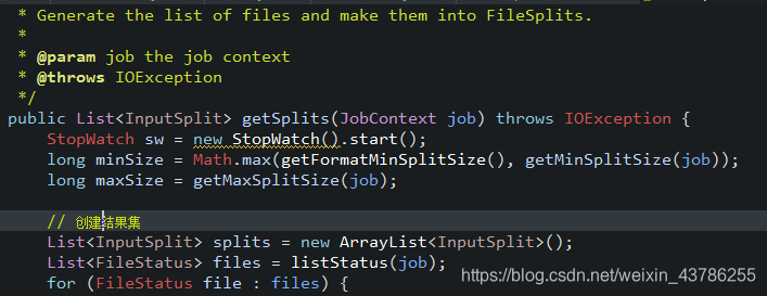 切片肯定是在map之前运行的,map之前的类是FileInputFormat文件加载,我们进入FileInputFormat类中,这个类中肯定会有切片相关的方法,getSplits方法就是进行逻辑切片的方法。首先看它的返回值:它的返回值是List集合,泛型是InputSplit,InputSplit对应的就是每一个逻辑切片对象,有一个逻辑切片就封装成这个对象,所以List集合就是封装所有切片对象的集合,所以返回值就是所有切片的集合。然后看它的参数JobContext job,是贯穿整个Job的上下文对象