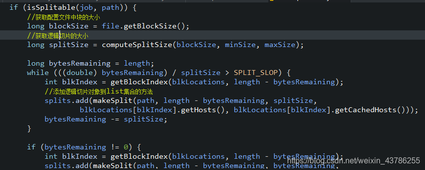 因为返回值是一个list集合,所以这个方法里面肯定有把切片放到集合的过程。添加切片到集合的方法如下图,其中splitSize为核心参数,既然这边有用了这个参数,那么前面肯定有对这个参数的赋值,往前走找到最早对这个splitSize赋值的语句。