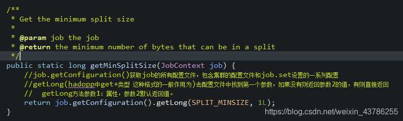 从mapred-default.xml中可知mapreduce.input.fileinputformat.split.minsize默认为0,所以SPLIT_MINSIZE为0,那么job.getConfiguration().getLong(SPLIT_MINSIZE, 1L)方法返回0。那么Math.max(getFormatMinSplitSize(), getMinSplitSize(job))的返回值是1即minSize为1。