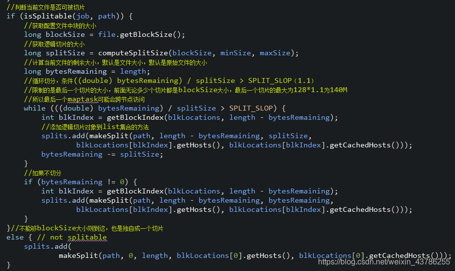 getSplits方法中创建存放inputSplit的结果集后获取输入路径下的所有文件,循环遍历这些文件,如果文件的长度不为0的话,判断是分布式文件系统还是本地文件系统,如果是分布式文件系统,获取当前文件的分块信息。然后再判断当前文件是否可切分,如果可以切分,获得逻辑切片大小和块大小,并定义一个当前文件剩余大小的属性,进行循环切分,条件是当前文件剩余大小除以逻辑切片大小大于1.1的话,所以一个文件的最后一个切片最大为128*1.1M,如果,最后一个切片大小为12M-128*1.1M的话会跨节点访问,但是这样还是比重新启动一个maptask的效率高。