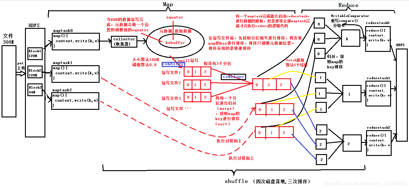 (3)将map()方法输出的 KV 进行shuffle处理,溢写,分区,排序分组等一系列操作;