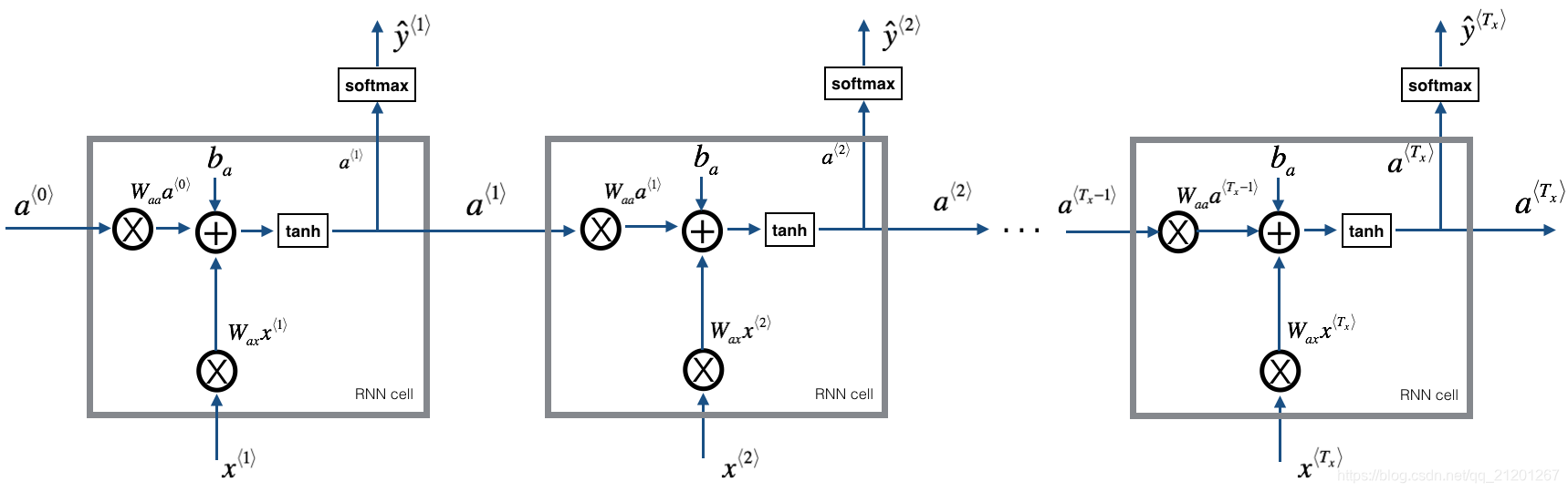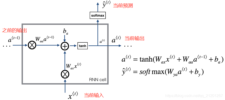 # GRADED FUNCTION: rnn_cell_forwarddef rnn_cell_forward(xt, a_prev, parameters):"""Implements a single forward step of the RNN-cell as described in Figure (2)Arguments:xt -- your input data at timestep "t", numpy array of shape (n_x, m).a_prev -- Hidden state at timestep "t-1", numpy array of shape (n_a, m)parameters -- python dictionary containing:Wax -- Weight matrix multiplying the input, numpy array of shape (n_a, n_x)Waa -- Weight matrix multiplying the hidden state, numpy array of shape (n_a, n_a)Wya -- Weight matrix relating the hidden-state to the output, numpy array of shape (n_y, n_a)ba -- Bias, numpy array of shape (n_a, 1)by -- Bias relating the hidden-state to the output, numpy array of shape (n_y, 1)Returns:a_next -- next hidden state, of shape (n_a, m)yt_pred -- prediction at timestep "t", numpy array of shape (n_y, m)cache -- tuple of values needed for the backward pass, contains (a_next, a_prev, xt, parameters)"""# Retrieve parameters from "parameters"Wax = parameters["Wax"]Waa = parameters["Waa"]Wya = parameters["Wya"]ba = parameters["ba"]by = parameters["by"]### START CODE HERE ### (≈2 lines)# compute next activation state using the formula given above# 按公式写即可a_next = np.tanh(np.dot(Wax, xt)+np.dot(Waa, a_prev)+ba)# compute output of the current cell using the formula given aboveyt_pred = softmax(np.dot(Wya, a_next)+by) ### END CODE HERE #### store values you need for backward propagation in cachecache = (a_next, a_prev, xt, parameters)return a_next, yt_pred, cache