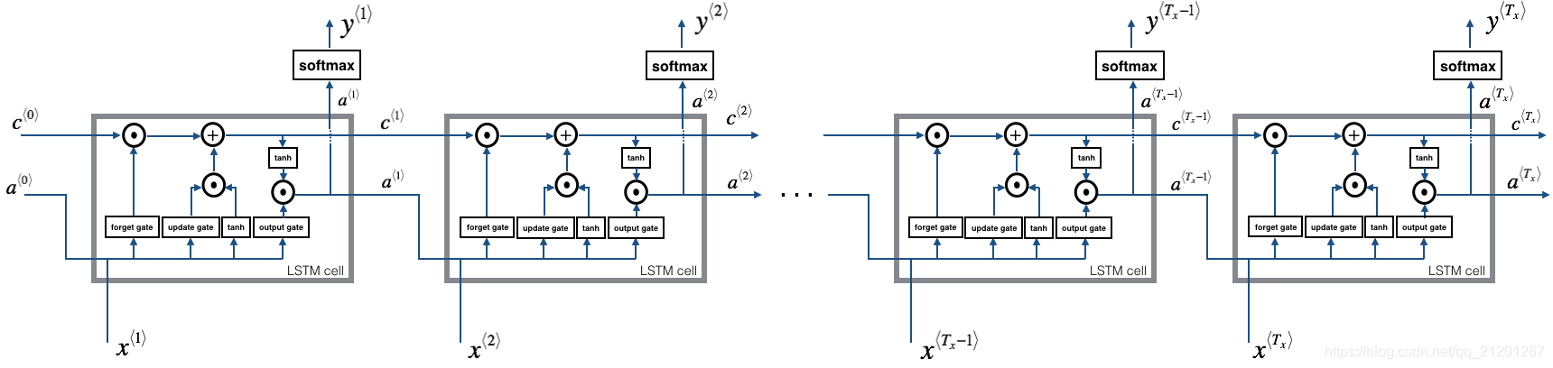 output存储每个时间步的 LSTM 单元 - for 循环 t∈[1,Tx]t \in [1,T_x]t∈[1,Tx]