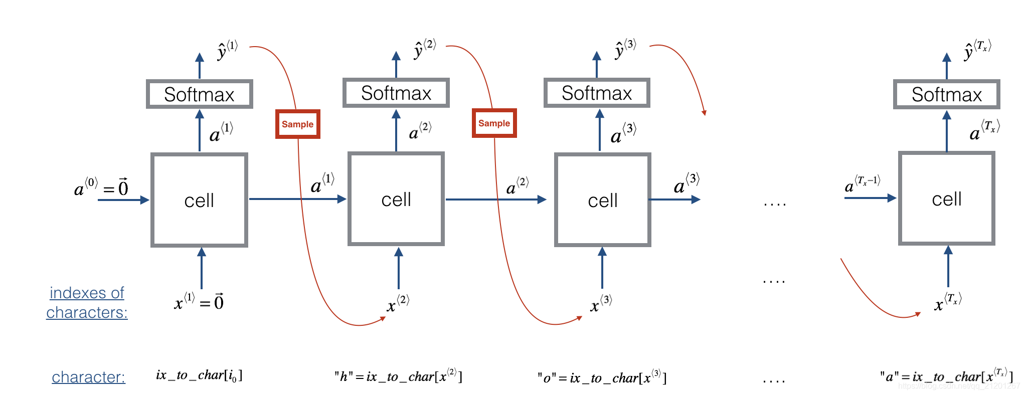 - 如何合成数据,通过在每个时间步采样预测并将其传递给下一个RNN单元