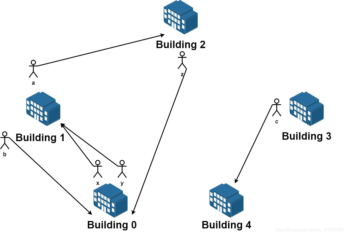 从楼 1 离开的员工为 a 和 b ,且他们分别想要搬到楼 2 和 0 。