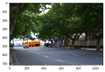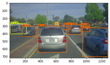 def predict(sess, image_file):"""Runs the graph stored in "sess" to predict boxes for "image_file". Prints and plots the preditions.Arguments:sess -- your tensorflow/Keras session containing the YOLO graphimage_file -- name of an image stored in the "images" folder.Returns:out_scores -- tensor of shape (None, ), scores of the predicted boxesout_boxes -- tensor of shape (None, 4), coordinates of the predicted boxesout_classes -- tensor of shape (None, ), class index of the predicted boxesNote: "None" actually represents the number of predicted boxes, it varies between 0 and max_boxes. """# Preprocess your imageimage, image_data = preprocess_image("images/" + image_file, model_image_size = (608, 608))# Run the session with the correct tensors and choose the correct placeholders in the feed_dict.# You'll need to use feed_dict={yolo_model.input: ... , K.learning_phase(): 0})### START CODE HERE ### (≈ 1 line)out_scores, out_boxes, out_classes = sess.run([scores, boxes, classes], feed_dict = {yolo_model.input:image_data, K.learning_phase(): 0})### END CODE HERE #### Print predictions infoprint('Found {} boxes for {}'.format(len(out_boxes), image_file))# Generate colors for drawing bounding boxes.colors = generate_colors(class_names)# Draw bounding boxes on the image filedraw_boxes(image, out_scores, out_boxes, out_classes, class_names, colors)# Save the predicted bounding box on the imageimage.save(os.path.join("out", image_file), quality=90)# Display the results in the notebookoutput_image = imageio.imread(os.path.join("out", image_file))imshow(output_image)return out_scores, out_boxes, out_classes