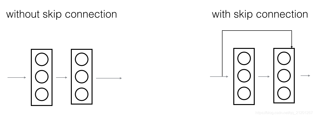 其 跳跃连接上有一个 CONV2D 卷积层,它没有使用非线性激活函数,作用是改变输入的维度,使后面的加法维度匹配