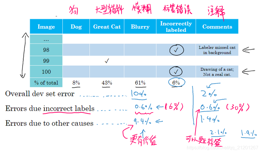(错误分类的图片里面有多少比例是狗🐶,假如错误率10%,其中狗占5%,那么你完全解决了狗的问题,能降低错误率到 9.5%,结合你花费的时间,评估下值不值当;如果错误分类中,狗占50%,那么解决狗的问题,就能降低错误率到 5%,还是很值得一试的) - 通常做法,统计各种误差的比例,检查哪种误差占比较高,优先解决