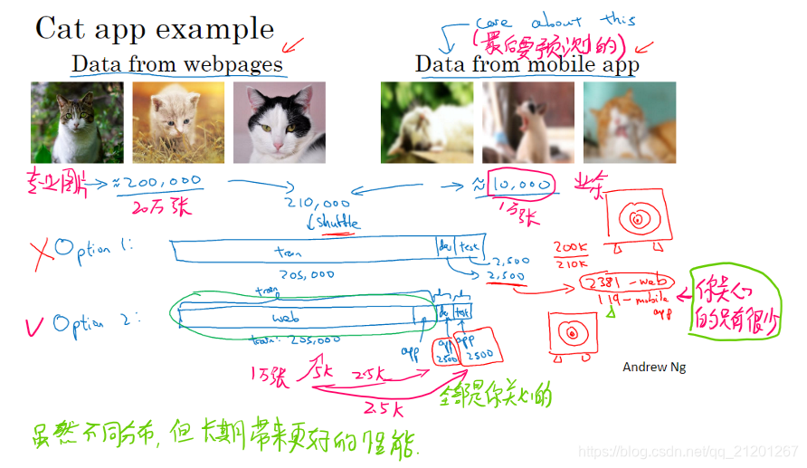 如果 训练数据 和 开发数据 来自不同的分布,特别是,也许算法在训练集上做得不错,可能因为训练集 很容易识别(高分辨率,清晰的图像),但开发集 难以识别得多。