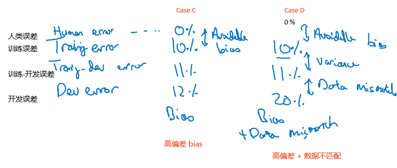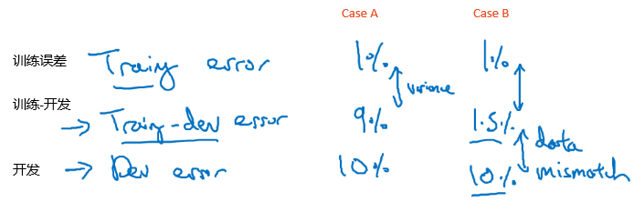 - 训练误差 & 训练-开发误差,差距 0.5 %,方差问题很小,但是在 开发集 上误差为 10%,训练-开发集 & 开发集 上的数据,模型都没有在上面训练过,由于他们是不同分布,模型擅长前者,而你关心的开发集,模型表现不好,这称之为数据不匹配