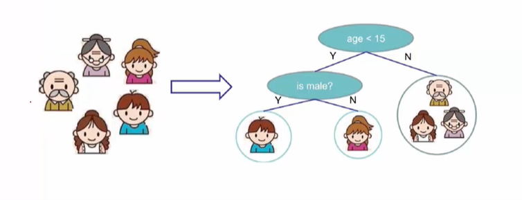 如图所示,一共有5个人,我们根据年龄和性别进行判断,这个人是否喜欢打篮球。我们首先根据年龄是否大于15来判断是否喜欢打篮球。如上,判断出年龄大于15的都不喜欢打篮球,年龄小于15的可能喜欢打篮球。第一次划分,左边的数据集还具有不确定性,因此,我们再次根据性别进行划分,直到叶子节点的数据集的纯度较高时,停止划分。如上的树就是一棵决策树,决策之意,就是我们在每个分支节点上都定义了一个决策属性(age、is male)。使用方法:我们只需要将数据集中的每一个样本从上往下依次去走,直至到达叶子节点,来求得其预测值。