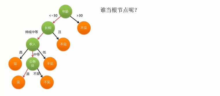 如上图,假设这是一个人要去见约会对象了,我们将根据约会对象的年龄、长相、收入、是否是公务员来预测其去不去见他的约会对象。首先看年龄,其次看长相,再其次看收入……,决策的先后代表其重要的程度。