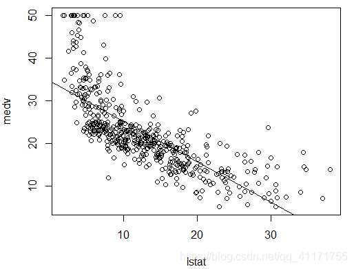 用函数 plot ()和 abline ()绘制 medv 和 lstat 的散点图以及最小二乘回归 直线。