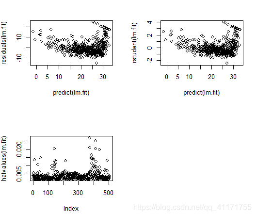 plot(predict(lm.fit), rstudent(lm.fit))plot(hatvalues(lm.fit))