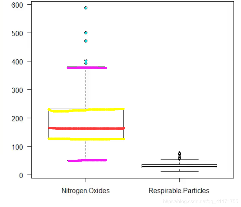 箱线图如上所示,简单解释一下,中间的红线是中位线,表示有50%的样本数据在其上方,50%在其下方,黄色的代表上/下四分位数线,上四分位数线,代表其上方有25%的样本数据,下方有75%的样本数据。下四分位数线以此类推。紫色的线代表上下界,表示最大数值线与最小数值。上方的蓝色的点代表异常值,可不予考虑,不必关心。