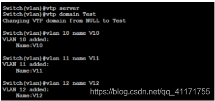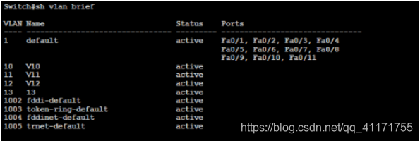 键入vlan 10 name V10 .....此处将虚拟局域网划分成4个局域网并命vlan10-vlan13.