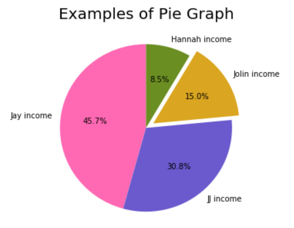 explodes = (0,0,0.1,0)#突出显示Jolin income这部分的饼图plt.pie(x,explode = explodes, labels=labels,colors = colors, startangle=90,autopct='%1.1f%%')plt.show()#显示图像