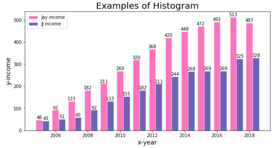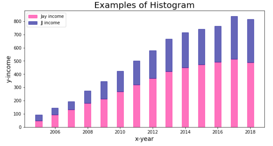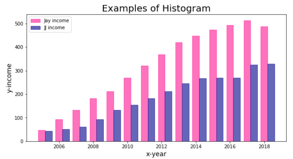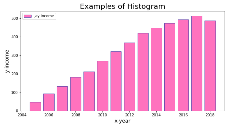 plt.bar(data['时间'],data['收入_Jay'], alpha=0.6,width = 0.8, facecolor = 'deeppink', edgecolor = 'darkblue', lw=1, label='Jay income')plt.legend(loc=2)#图例展示位置,数字代表第几象限