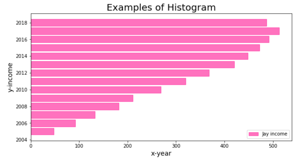 plt.barh(data['时间'],data['收入_Jay'], alpha=0.6, facecolor = 'deeppink', edgecolor = 'deeppink', label='Jay income')plt.legend(loc=4)#图例展示位置,数字代表第几象限
