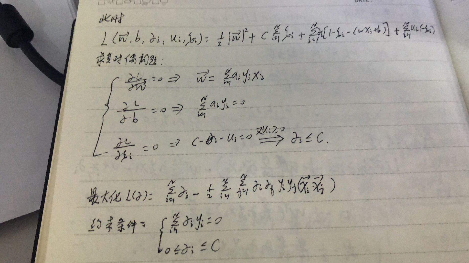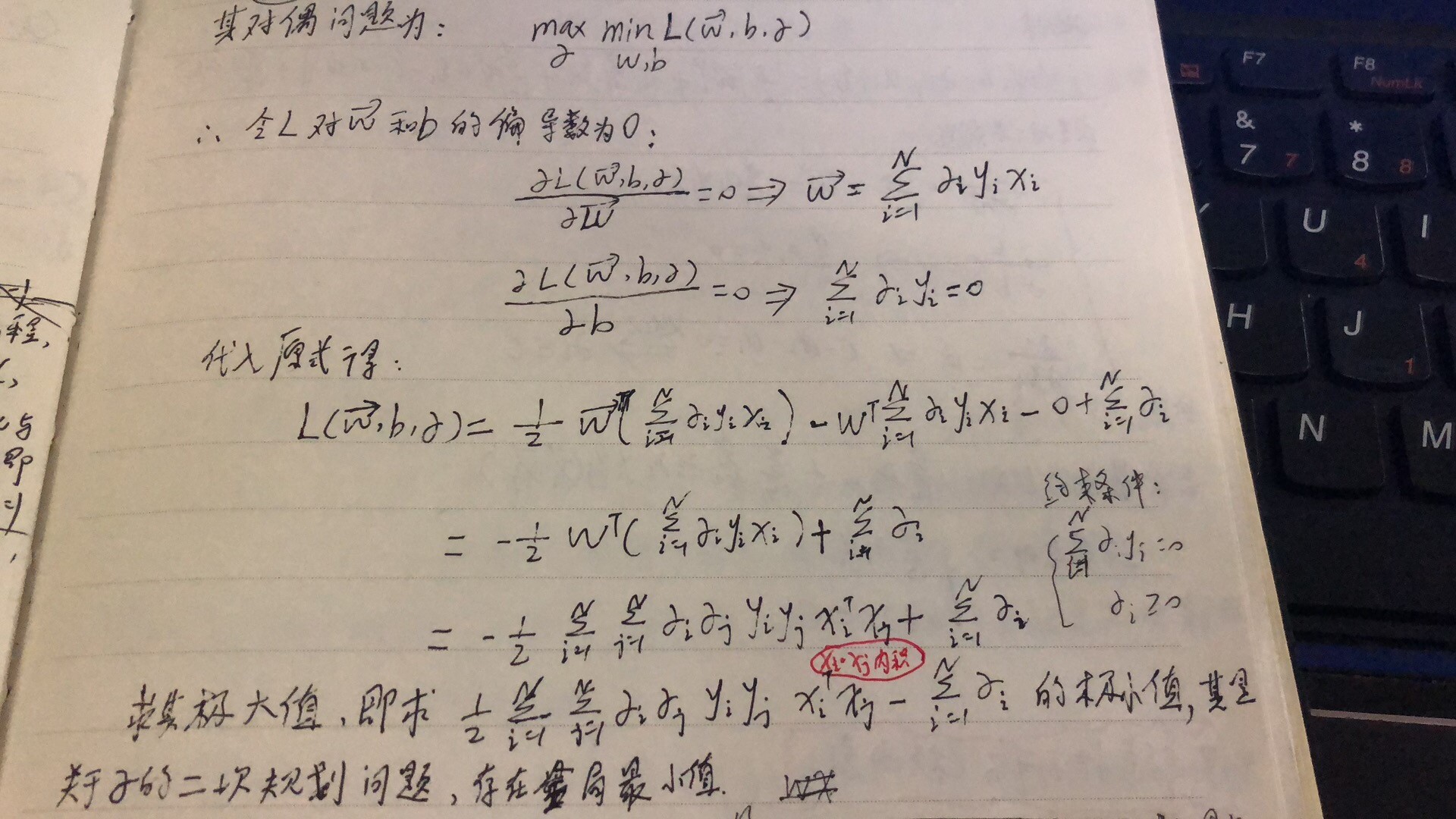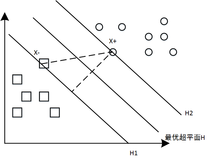 空间中任何一个平面的方程都可以表示为wx+b =0,如上图,设最优超平面方程H为wx+b=0,支持向量x-到H的距离为