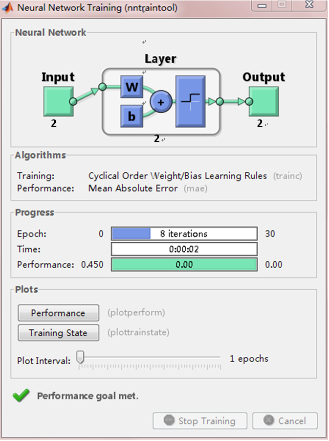 net=train(net,P,T); %使用训练函数对创建的网络进行训练