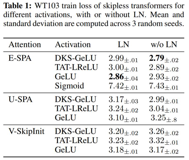 在表 1 中,该研究使用提出的方法评估了 MLP 块中不同激活函数的影响,以及 LN 在无残差 transformer 的使用。可以看到在深度为 36 处,本文方法针对一系列激活实现了良好的训练性能:DKS-transformed GeLU、TAT-transformed Leaky ReLU 以及 untransformed GeLU ,但不是 untransformed Sigmoid。通过实验还看到,层归一化对于训练速度而言相对不重要,甚至在使用 SPA 时对 transformed activation 的激活有害,因为 SPA 已经具有控制激活规范的内置机制。