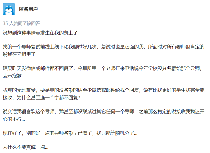 所以一般大家都会提前联系导师询问有无招生名额。如果导师明确表示接受而学生在临门一脚突然变卦的话,会导致很多导师出现名额空缺问题,也就是白白浪费掉名额,这也难怪导师会生气到“向教育部反馈失信信息”。