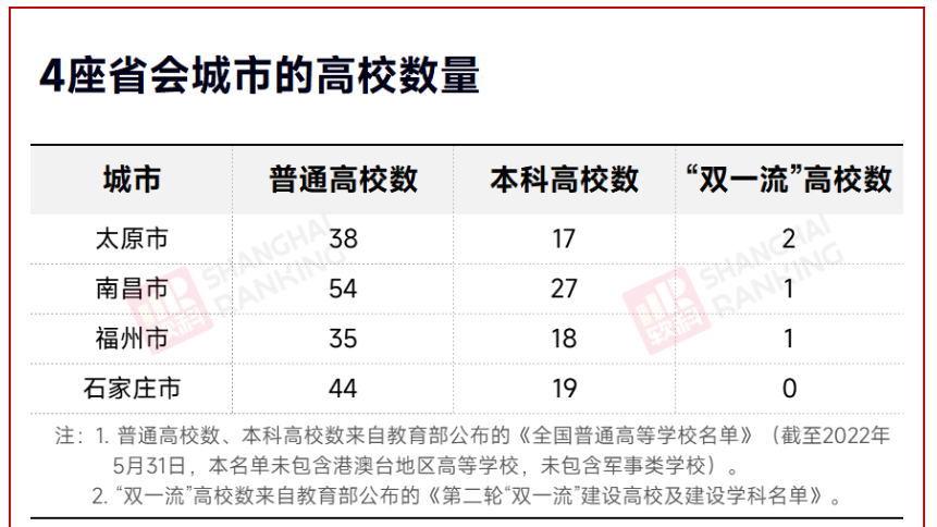 从“双一流”高校数量上来看,太原市仅有山西大学、太原理工大学两所“双一流”,南昌大学、福州大学分别作为南昌市、福州市的“双一流”独苗,扛起了省会人民的厚望,而石家庄,则是全国唯一一个当地没有“双一流”高校的省会。