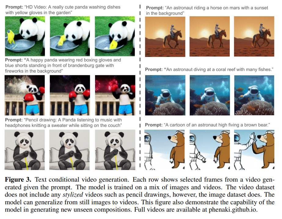 更麻烦的是,像之前那种用于图像生成的简短文本 prompt 通常不足以提供对视频的完整描述,视频需要的是一系列 prompt 或故事。理想情况下,一个视频生成模型必须能够生成任意长度的视频,并且要能根据某个时刻 t 的 prompt 变化调节生成的视频帧。只有具备这样的能力,模型生成的作品才能称之为「视频」,而不是「移动的图像」,并开启在艺术、设计和内容创作方面的现实创意应用之路。