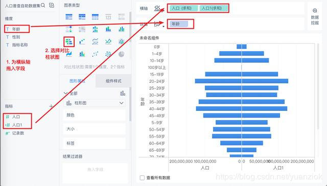 将年龄拖入横轴,将人口和人口1字段都拖入纵轴,并在图表类型处选择对比柱状图,如下图: