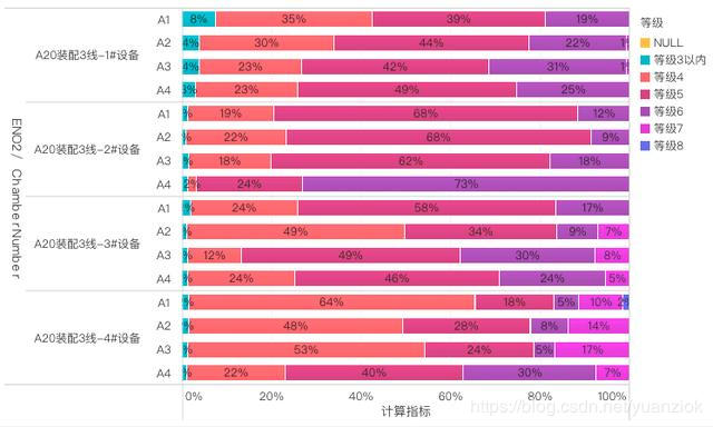 交换该横纵轴字段,为计算指标字段开启堆积按钮,并将等级字段拖入图形属性下的颜色栏,如下图,同时为该计算指标字段设置数值格式为百分比;