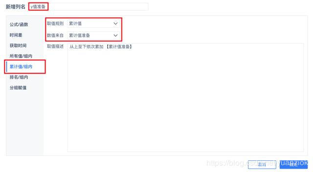 再新增列,添加列名为y值准备,选择累计值/组内,并设置取值规则为累计值,数值来自累计值准备,如下图: