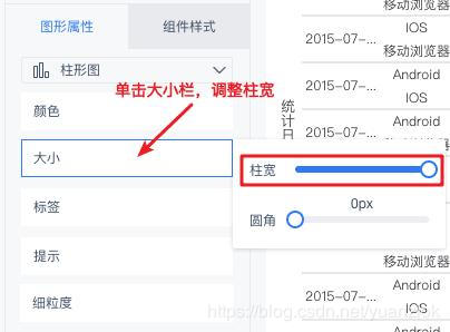 点击确定保存该值轴设置,同时可以设置分类轴取消显示轴标题。在图形属性下的大小栏,调整柱宽为最大值,如下图: