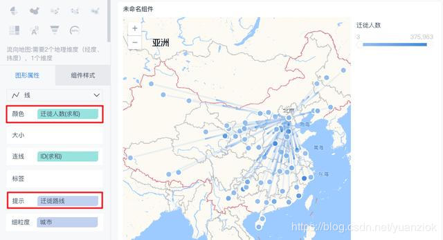 如果我们想增加迁徙人数的说明,即按照迁徙人数来调整流向线的颜色,此时就需要将迁徙人数字段拖拽至图形属性下的颜色栏,并将原来的迁徙路线字段移动至标签/提示/细粒度中城市上方,选择任一位置移动即可,如下图: