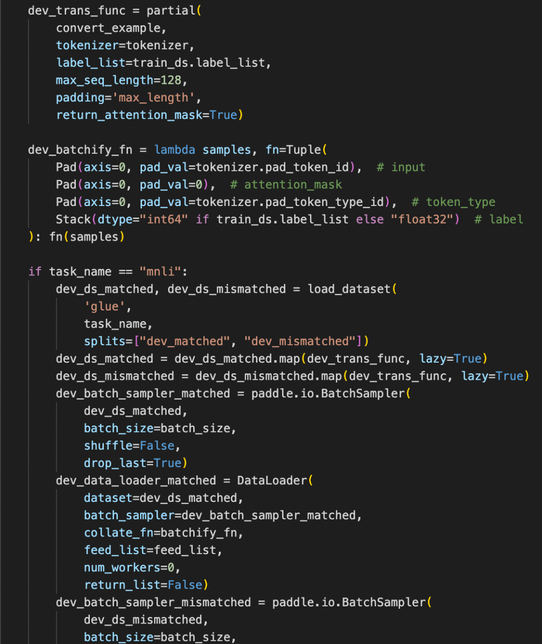 pytorch2paddle(torch_model,save_dir='./x2paddle_cola/',jit_type="trace", input_examples=[input_ids, attention_msk, token_type_ids])2.准备训练数据&定义DataLoader。本案例默认以GLUE数据进行自动压缩实验,PaddleNLP会自动下载对应数据集。