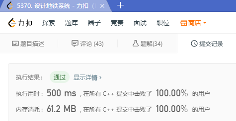 public:UndergroundSystem() { }void checkIn(int id, string stationName, int t) {id_startStation.insert({id,make_pair(stationName,t)});// 乘客id;(起点,出发时刻)}void checkOut(int id, string stationName, int t) {s = {id_startStation[id].first, stationName};//起点,终点if(!station_time_n.count(s))station_time_n.insert({s,{t-id_startStation[id].second,1}});else{station_time_n[s][0] += t-id_startStation[id].second;station_time_n[s][1] += 1;}id_startStation.erase(id);}double getAverageTime(string startStation, string endStation) {s = {startStation, endStation};return station_time_n[s][0]/double(station_time_n[s][1]);}