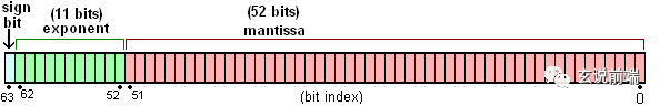 - 指数位 E:中间的 11 位存储指数(exponent),用来表示次方数