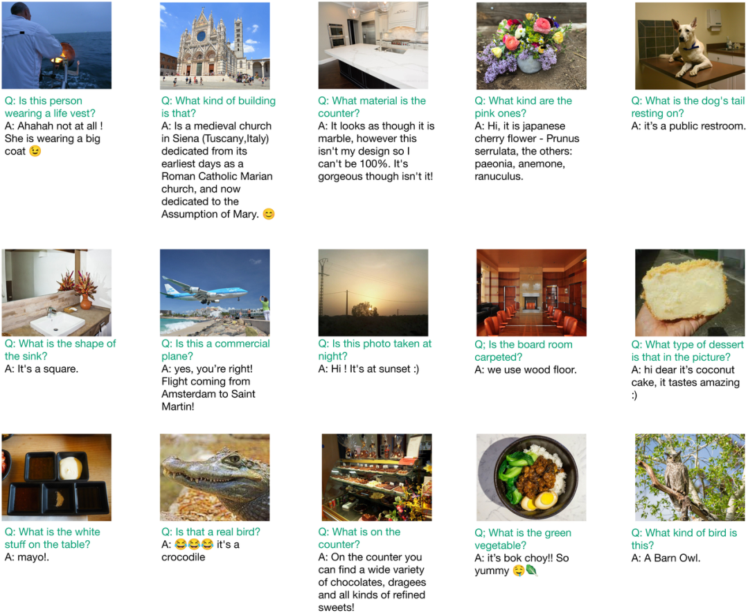 这种使用自然语言来获取视觉知识的方法,可以用来测试很多计算机视觉识别任务,如对象检测(“图像中有什么?”)、细粒度识别(“花瓶里是什么花?”)、属性分类(“这张桌子是用什么材料做的?”)、知识库推理(“这份食物是素食吗?”)和常识推理(“这张照片是在冬天拍摄的吗?”)等等。