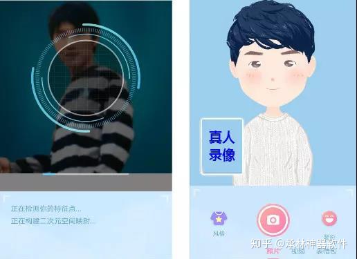 打开后点击绘制动漫形象,可以在相册中选择一张提前保存好的头像,或者直接选择打开相机拍一张自己的照片,软件会自动扫描分析,稍等几秒钟,分析完成后会进入到一个录像界面。